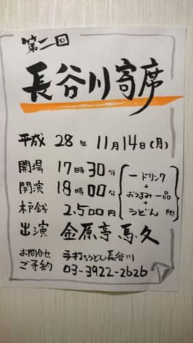 珍しく連続更新、馬久です。 今日は大泉学園のうどん屋さん「長谷川」で落語会でした。 いやぁ、本当にいい会です。温かいお客様で。 第二回ということでしたが、お足元の悪い中お集まり頂き、ありがとうございました。 また、うどんも女将の料理も本当に美…