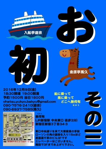 どうも、先日、BS日テレ「真麻のドドンパッ!」の三平師匠のコーナーに一瞬映った馬久です。 有吉ジャポン以来のTV出演でした。 今日は連雀亭ワンコイン寄席でした。 A太郎兄さん「家見舞」 翔丸兄さん「熊の皮」 馬久「井戸の茶碗」 の三本でお届けしました…