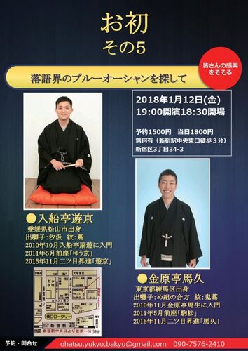 明けましておめでとうございます。 1月の出演情報です。 『なまらく初席』【日 時】1月2日(火)【場 所】番衆亭 新宿区新宿5ー10ー10 エビサワビル201 【時 間】開場/13:30 開演/14:00【木戸銭】1000円【出演者】立川幸之進、柳家小太郎、金原亭馬久、三…